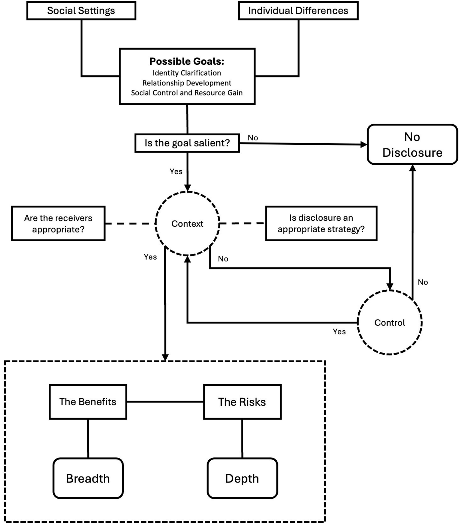 Our results largely align with foundational theories like Self-Presentation Theory and Social Exchange Theory, showing users strategically adapt disclosures to context and weigh perceived benefits against risks. However, the unique characteristics of XR—its immersive nature and the blending of physical and digital identities—necessitated a refinement of existing models. A key theoretical contribution of this work is an adapted Disclosure Decision Model (DDM) for XR social settings. This adapted model emphasizes the amplified role of context and user control in shaping disclosure decisions (depth and breadth) in these hybrid environments.